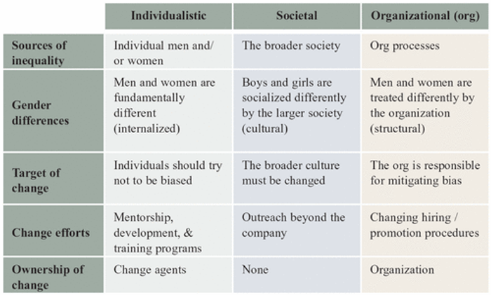 Figure one in the article puts all of the information provided in the article about viewpoints on inequality and pulls it all together in a concise table. It is not just one of these views that create inequality, it is all of them: the Individualistic, the Societal, and the Org. view. Each one requires targeting different groups to bring about change. However, as you can see from the Societal viewpoint, there is no direct point of contact to take ownership of the change. Society as a whole has to change.
