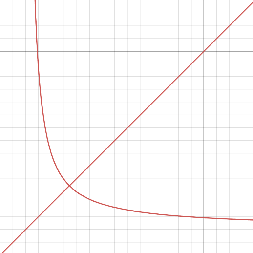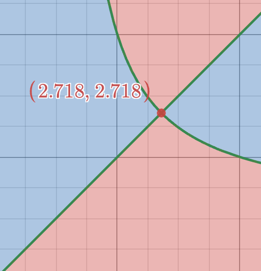 So there’s a series of complicated equations we can go through to kindddddd offfff solve it, but let’s skip those and use e as a reasonable guess. And guess what, plotting (e,e) gives us a pretty reasonable spot.