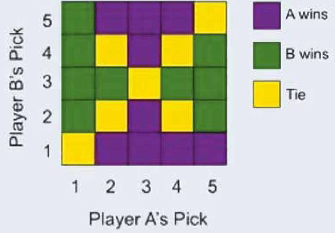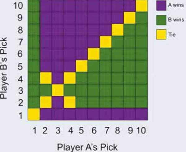 Alright here’s game 1. Let’s play rock paper scissors with numbers. We have 5 options: 1, 2, 3, 4, and 5. We each choose 1. My number is my base and your number is my exponent and vice versa. Highest number wins. Here’s an example. I’ll choose 2. You can have 4. Therefore my number is 2^4 and your’s is 4^2. Would you look at that? We tied! Take a couple tries with the people around you and once you’re done, take a look at the image below for a cheat sheet.